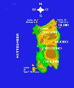 Geologisch ist Sardinien mit Korsika verbunden. Im wesentlichen besteht die nur relativ dünn besiedelte Insel (ca. 1,6 Mio. Einwohner) aus Bergen (am höchsten das Massiv des Gennargentu mit 1834 m) mit Hochebenen und fruchtbaren Senken; umgeben ist die Hauptinsel von zahlreichen, landschaftlich meist eindrucksvollen kleineren Inseln. Im teilweise schwer zugänglichen und einsamen Inselinneren überwiegt Landwirtschaft, vor allem Schafzucht, doch auch Getreide- und Weinanbau. Die sehr zerklüfteten Küsten (ca. 1500 Km Küstenlinie) formen unzählige Buchten mit herrlichen Stränden und glasklarem Wasser; sie faszinieren den Betrachter durch außergewöhnliche Farben und Formen mit starken Kontrasten.