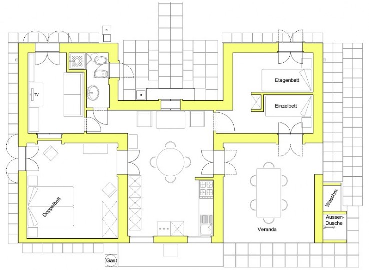 Das Haus hat ca. 60 Quadratmeter Wohnfläche und eine überdachte Veranda.